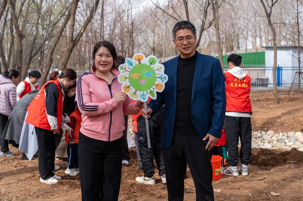 各班级与幼儿园大班、中班、小班结对,组成“护绿小分队”。大学生与孩子们分工协作,挥锹铲土、扶苗培土、提桶浇水,共同栽种树苗。大学生们耐心示范植树技巧,孩子们则用稚嫩的小手扶稳树苗,并在树旁插上“班级结对认养牌”,象征着共同守护绿色未来的承诺。最后,夏卫东与万晓霞共同为“‘童’‘信’林”揭牌。
