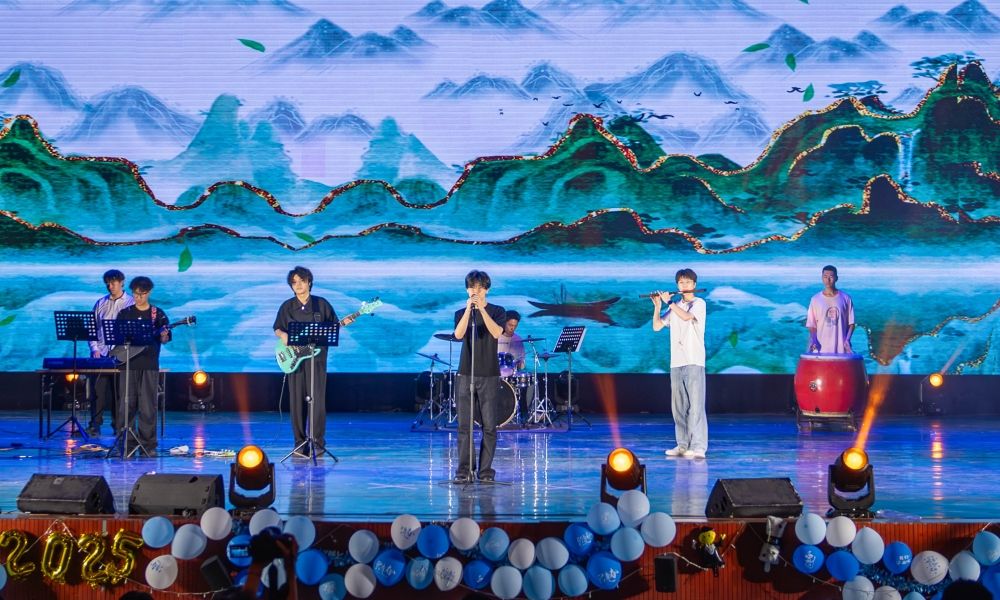 李童童老师带来大气磅礴的独唱《和谐中国》,用歌声传递家国情怀,以优美旋律唱响时代华章。当《平凡之路》《你曾是少年》《凤凰花开的路口》这些熟悉的旋律响起,台下观众自发点亮手机闪光灯,化作星海随节拍轻轻摇曳,全场沉浸在这场关于青春、成长与告别的集体回忆中。活力四射的舞蹈串烧《Funk Alarm》和《One Spark》中,2023级辅导员郑威老师与Only Crew舞社的同学们以极具感染力的舞姿,完美演绎了青春的蓬勃朝气与无限可能。在庄重激昂的朗诵节目《廉洁颂》中,用掷地有声的语调、饱满真挚的情感,为青春年华注入清正廉洁的责任底色。灯影戏《我们的四年青春》以其独特的艺术形式成为最动人的“情感催化剂”,通过光影的魔力将大学四年的成长蜕变、青春追忆与离别愁绪娓娓道来,引发全场共鸣。毕业生们自己作词改编的歌曲《二环南路的日子》,以饱含深情的歌词和旋律,为全场带来了一场对“济大”的青春告白,让四年的欢笑与泪水都在歌声中得到了最完美的诠释。在晚会的尾声,一曲精心编排的歌曲串烧《光阴的故事》与《明天会更好》将现场气氛推向高潮,当熟悉的旋律响起,台上台下共同哼唱,共同谱写毕业季最动人的青春乐章。
