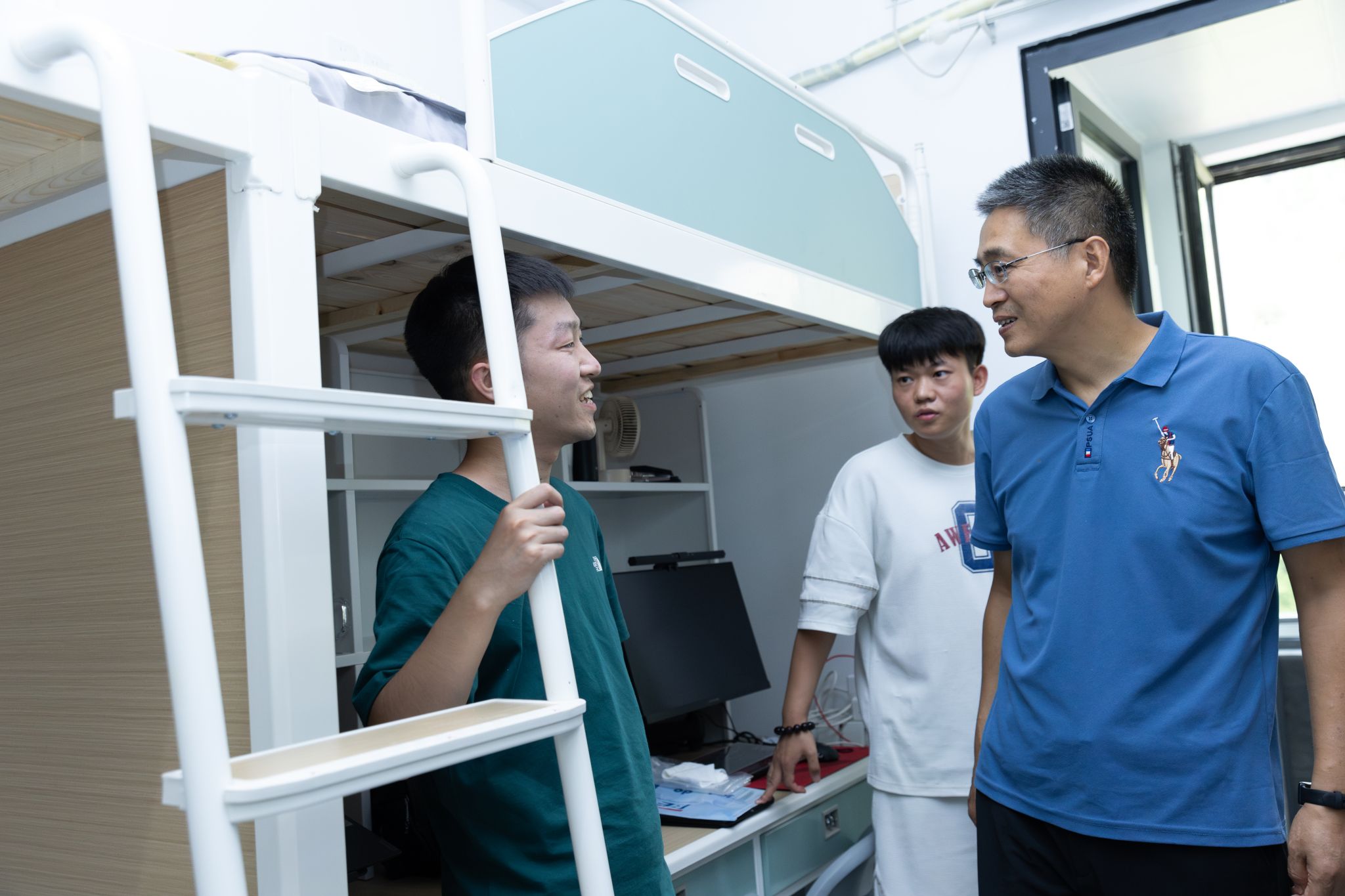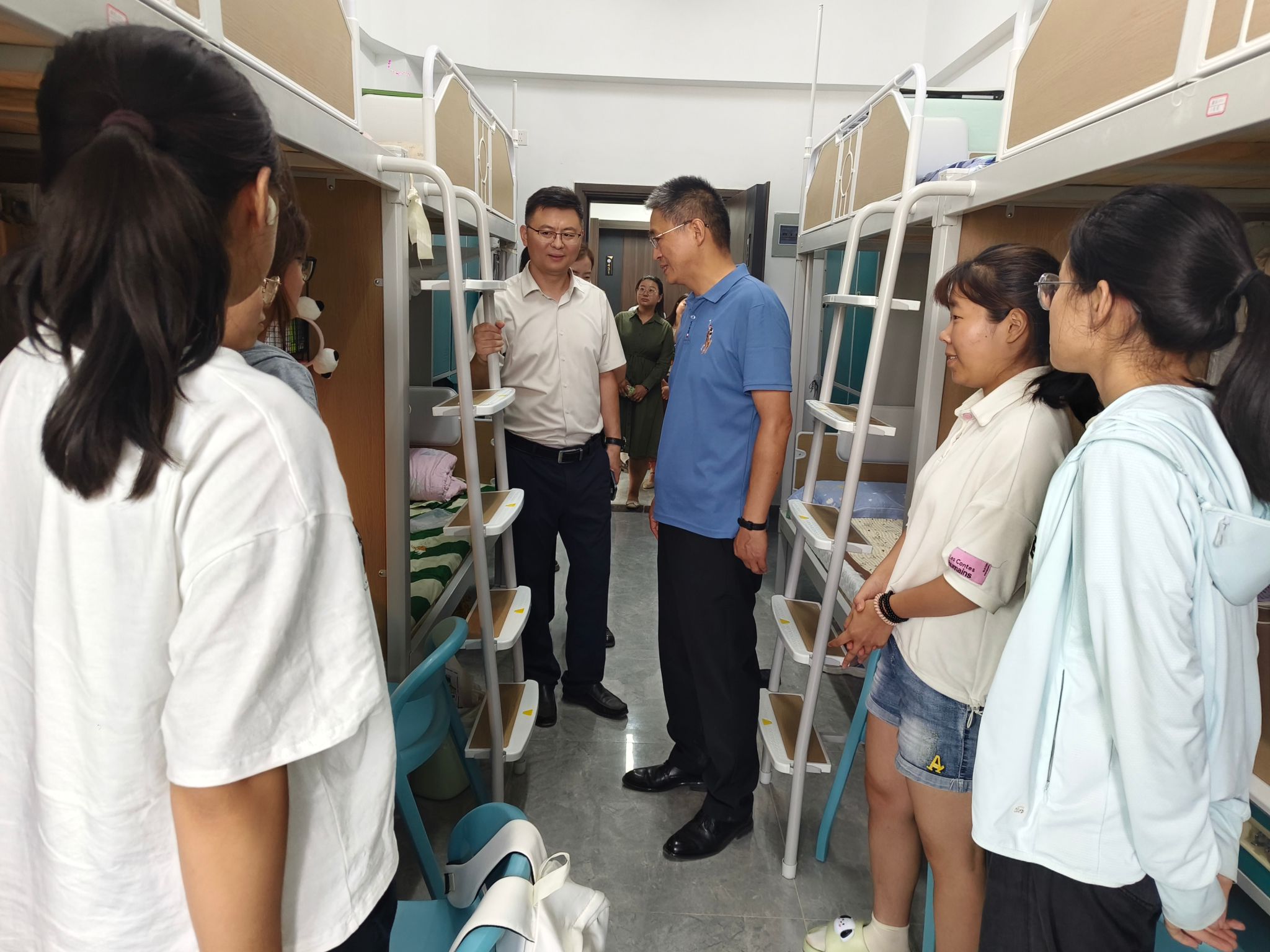 领导与辅导员、班主任组成慰问小组,逐一走访了新生宿舍,为初入校园的同学们送上关怀与指引。走进宿舍,老师们首先亲切地与同学们及陪同家长打招呼,仔细查看了宿舍的床铺整理、物品摆放情况,询问大家是否顺利完成入住、生活必需品是否齐全、对住宿环境是否适应。在与新生的交谈中,老师们耐心倾听大家的到校感受,鼓励同学们尽快调整状态,快速融入集体生活,并主动分享了适应大学学习节奏、参与校园活动的经验建议。