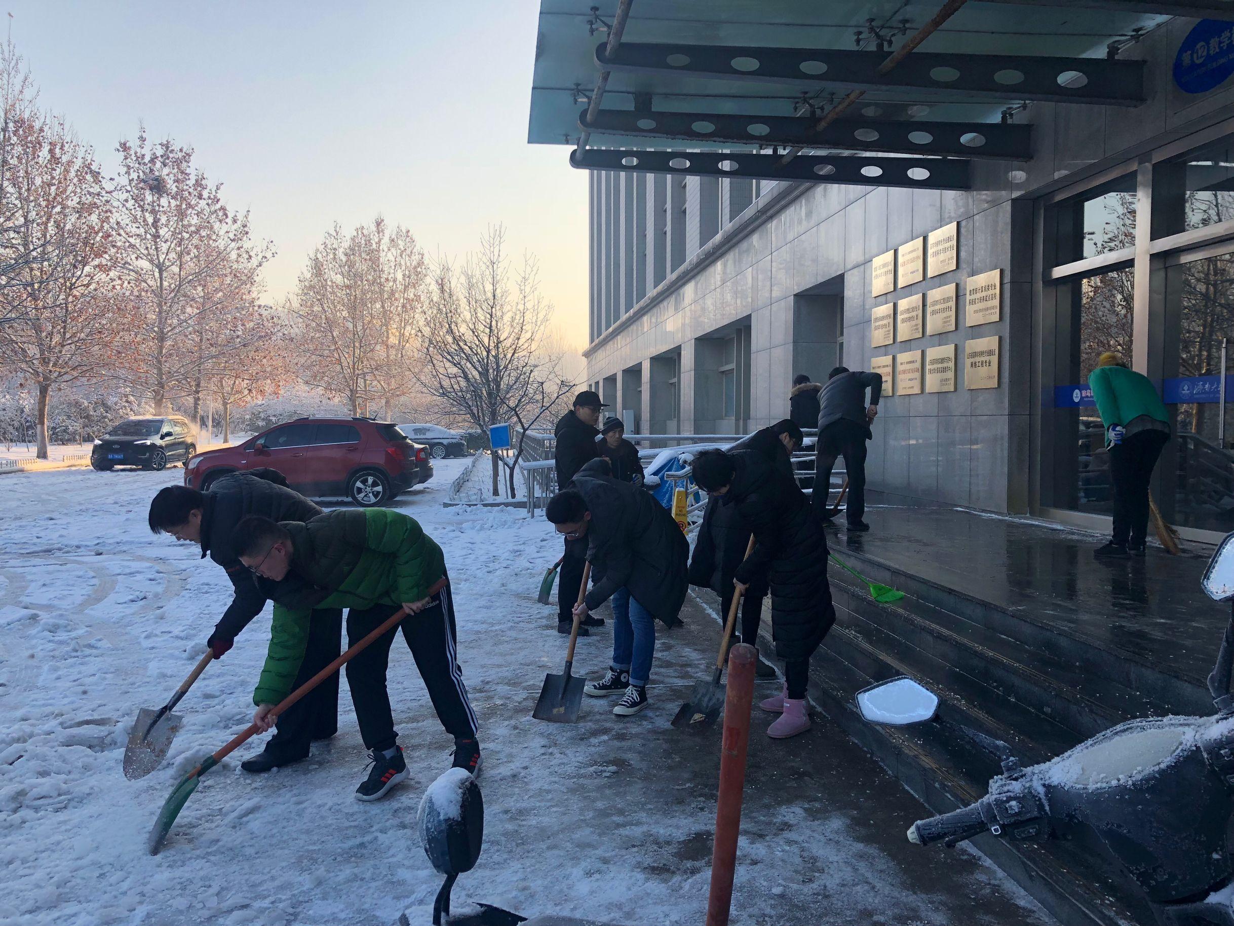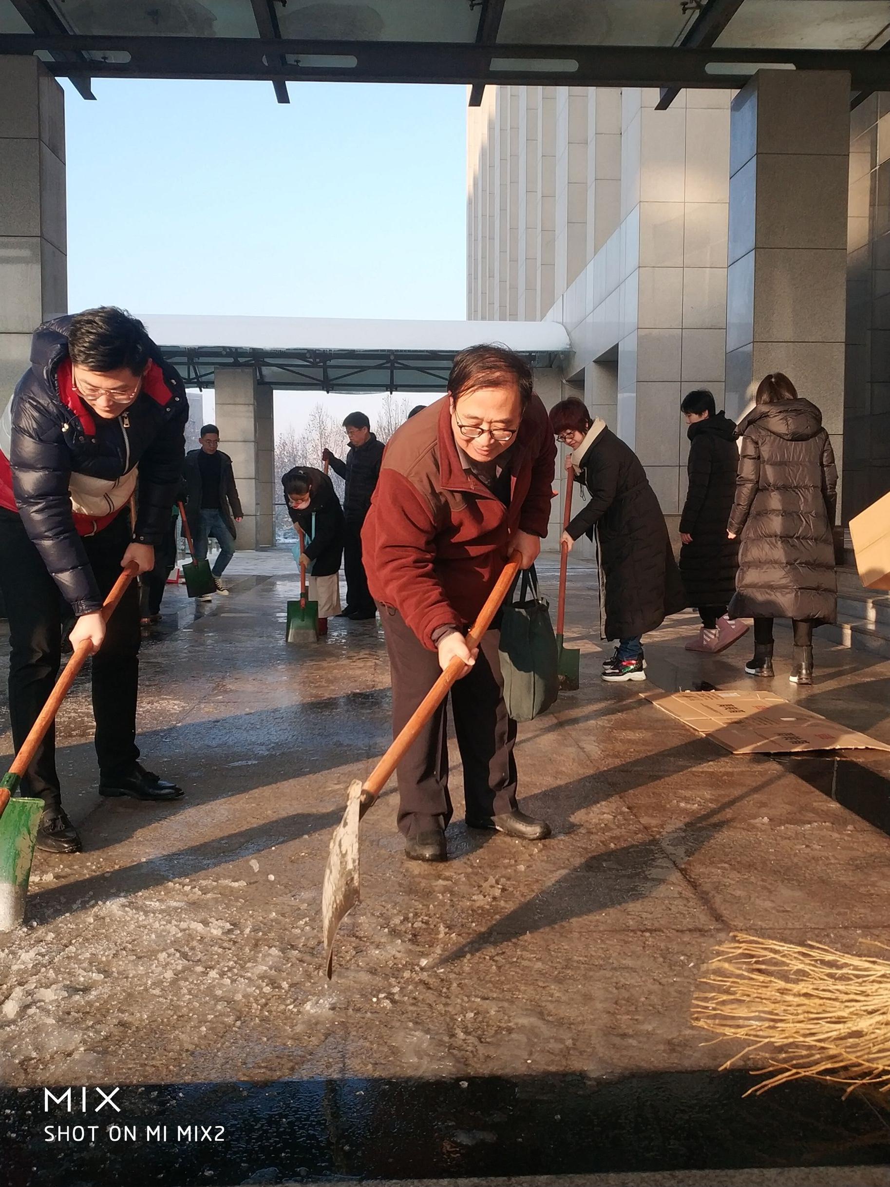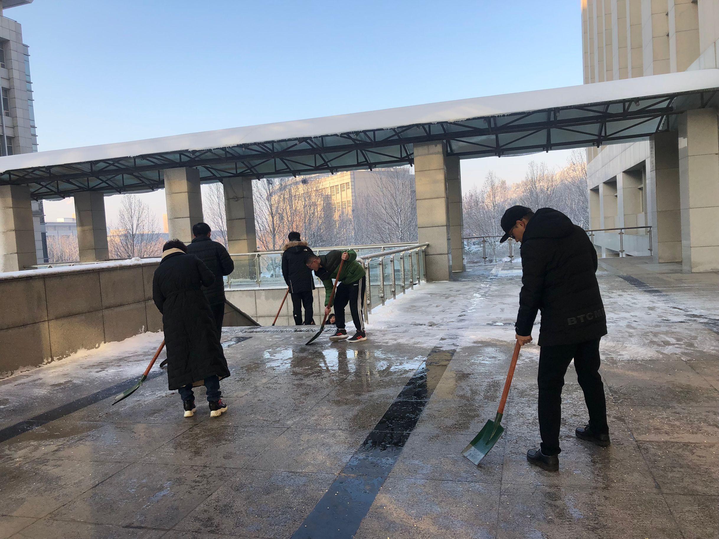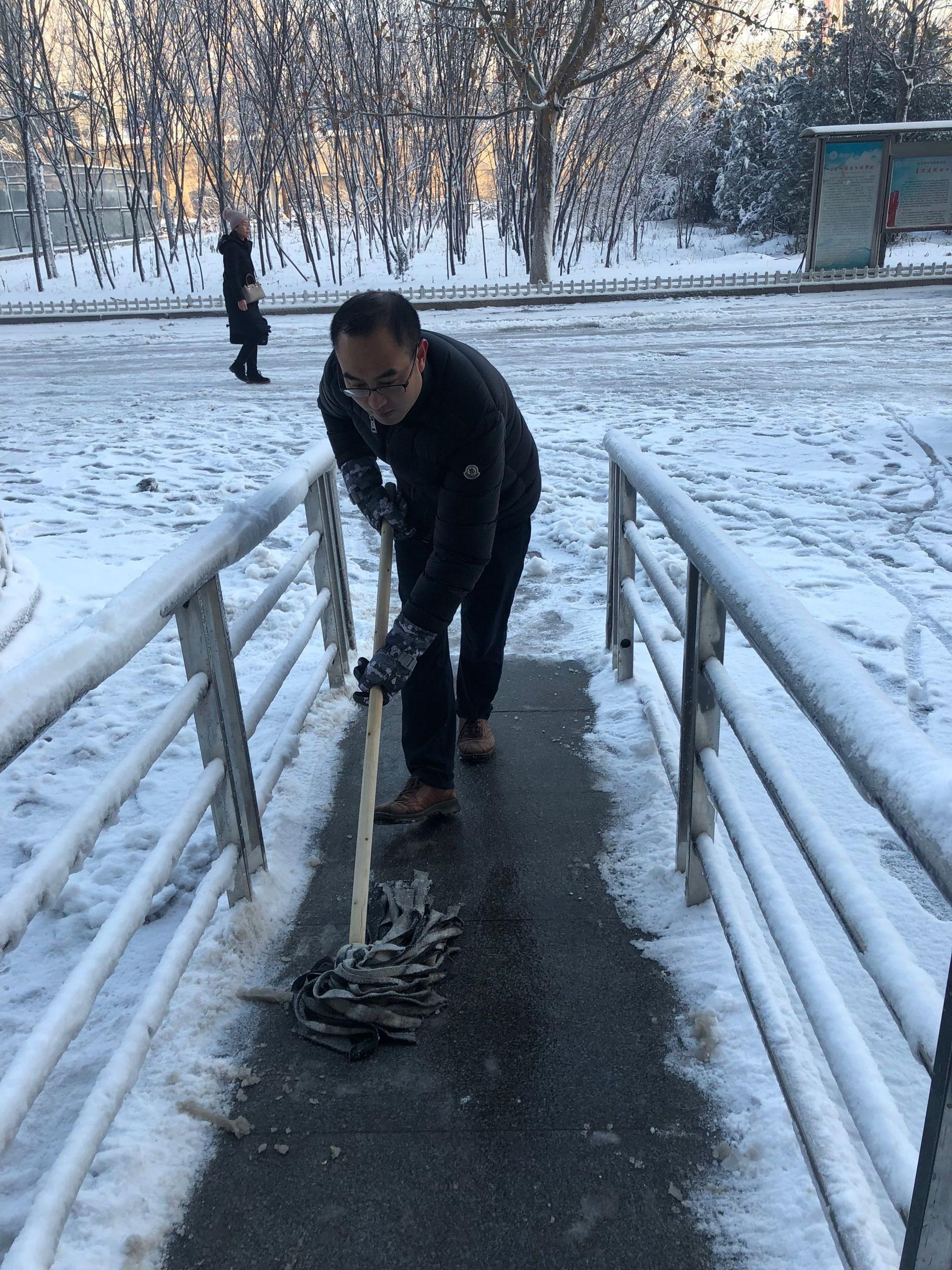 部分教职工以及学生志愿者积极行动起来,开展扫雪除冰活动,清除性吧
