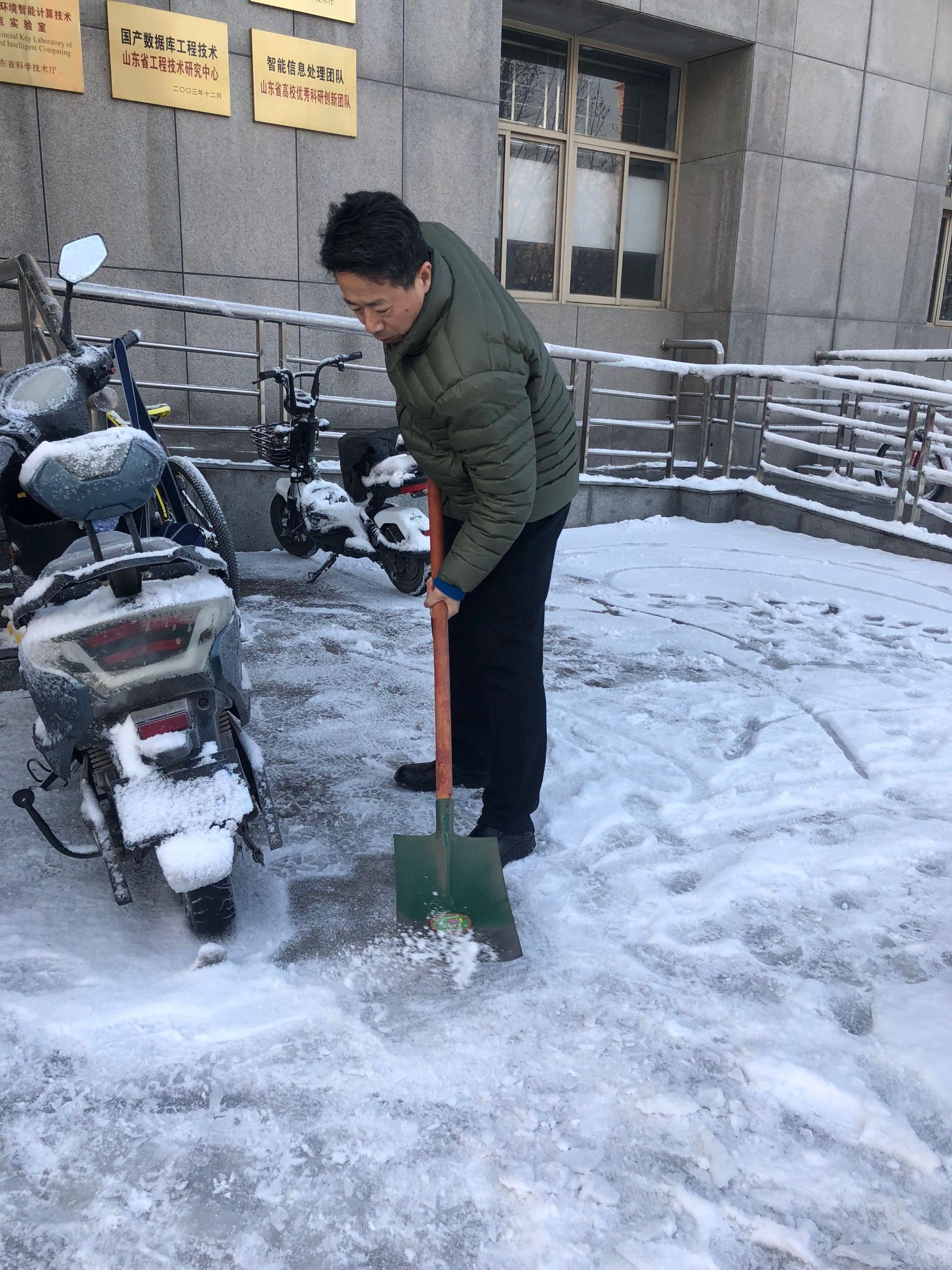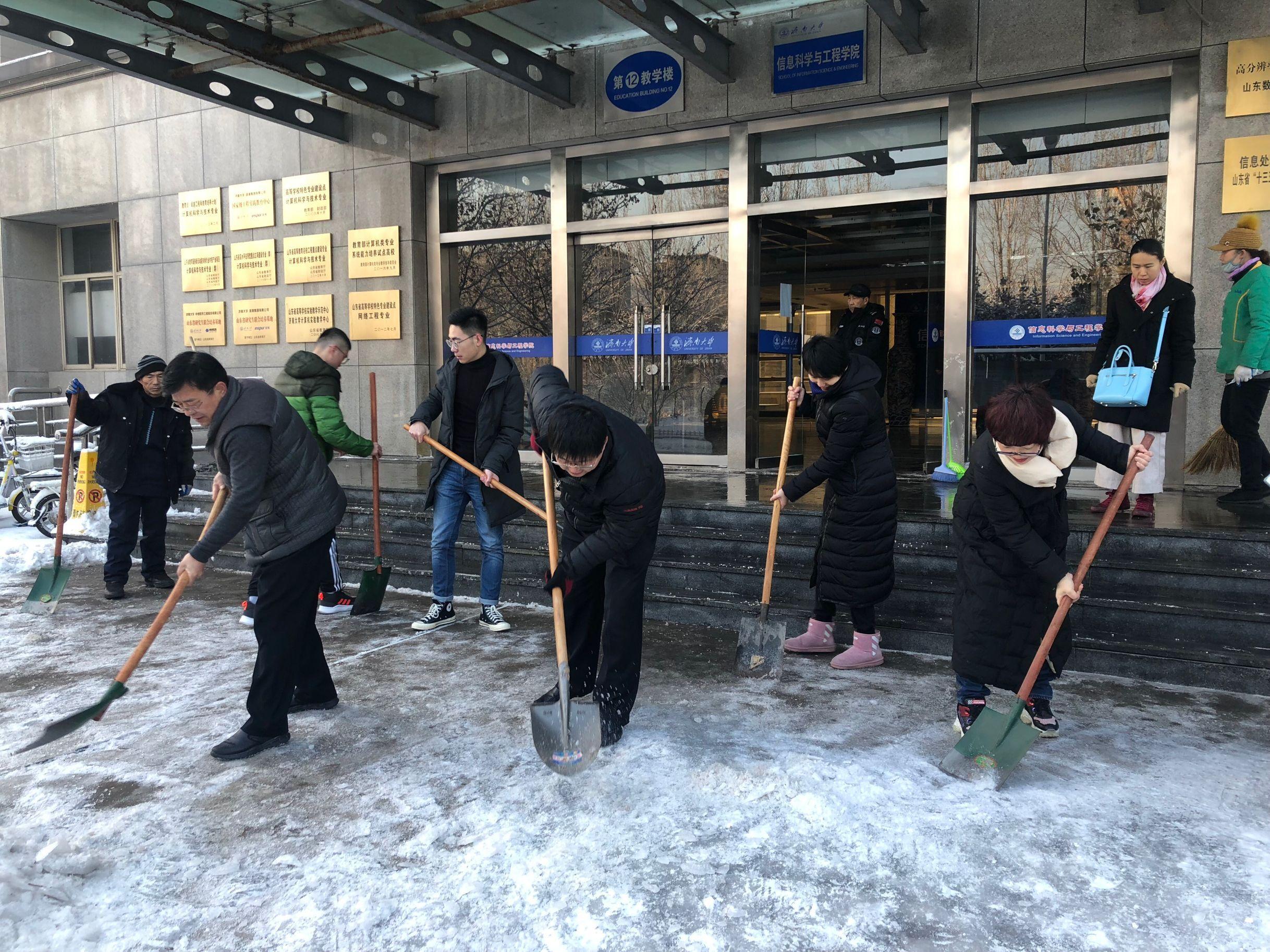 主干道和周围积雪,方便师生出行。大家手拿铁锨、扫帚等工具,从教学楼前开始,依次沿楼前东西通道、教学楼北侧逐一清理积雪。扫雪现场,老师们齐心协力,配合默契,干得热火朝天。虽然室外温度很低,但大家劳动的热情和团结协作的力量让这个冬日变得格外温暖。经过大家的努力,性吧