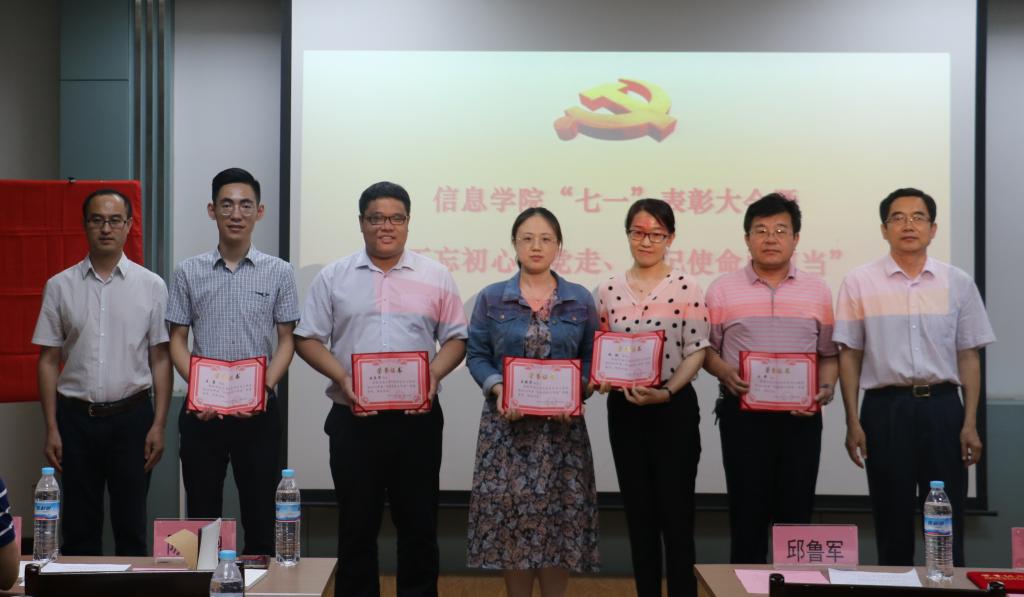 党委委员、副院长陈贞翔宣读《关于表彰优秀共产党员 优秀党务工作者和优秀党支部的决定》(济大信息党字〔 2019 〕02号)。党委班子成员分别为王玉泰等10名优秀共产党员、王晓芳等5名优秀党务工作者、电子与通信工程系教工党支部等4个党支部颁发荣誉证书。