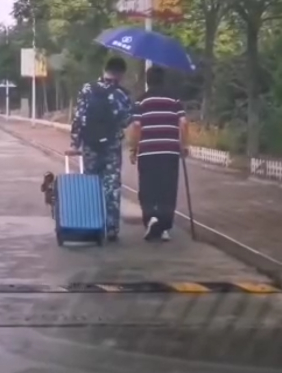 的大一新生秦庆龙在领完新书后,在路上遇见了视频中那位已经80多岁的老人。秦庆龙左手拉着装满新书的沉甸甸的行李箱,雨伞几乎全部遮在老人上方,秦庆龙自己的肩膀和背部露在雨中,他的左半身很快被雨滴湿透,但手中的雨伞仍纹丝不动,老人拄拐慢慢的前进着,他便陪着老人亦步亦趋地向前进着,他那自然而又坚定的举动,让人倍感暖心。伞下的老人是济南大学土木建筑性吧