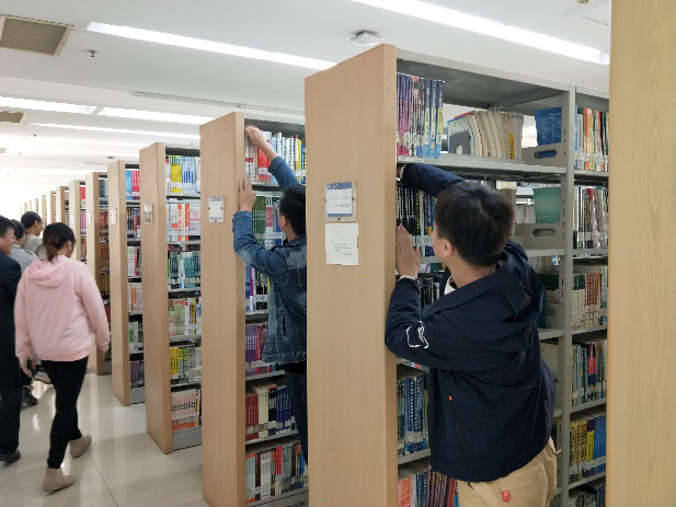 研究生第二党支部18名党员积极参与,同学们认真服务,将图书馆501室书架上的书摆放整齐,并进行了图书分类,将放错位置的图书放回原处。
