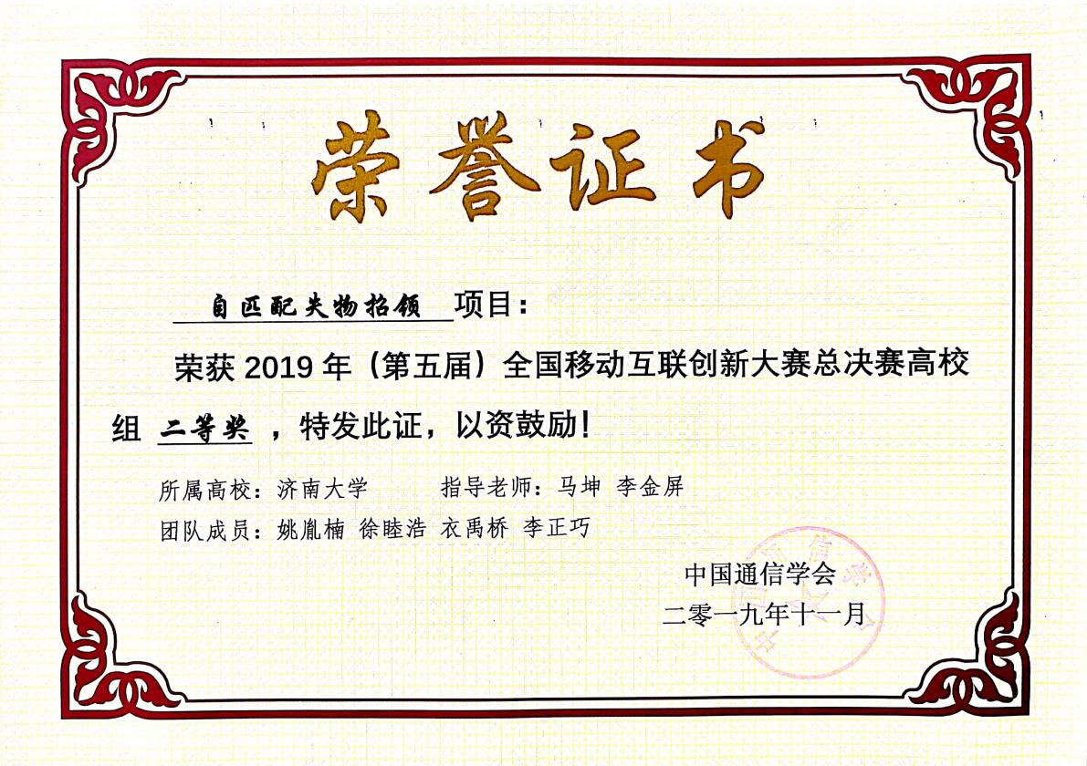 教师马坤、李金屏指导,学生姚胤楠、徐睦浩、衣禹桥、李正巧组成的团队以“自匹配失物招领”项目荣获二等奖。