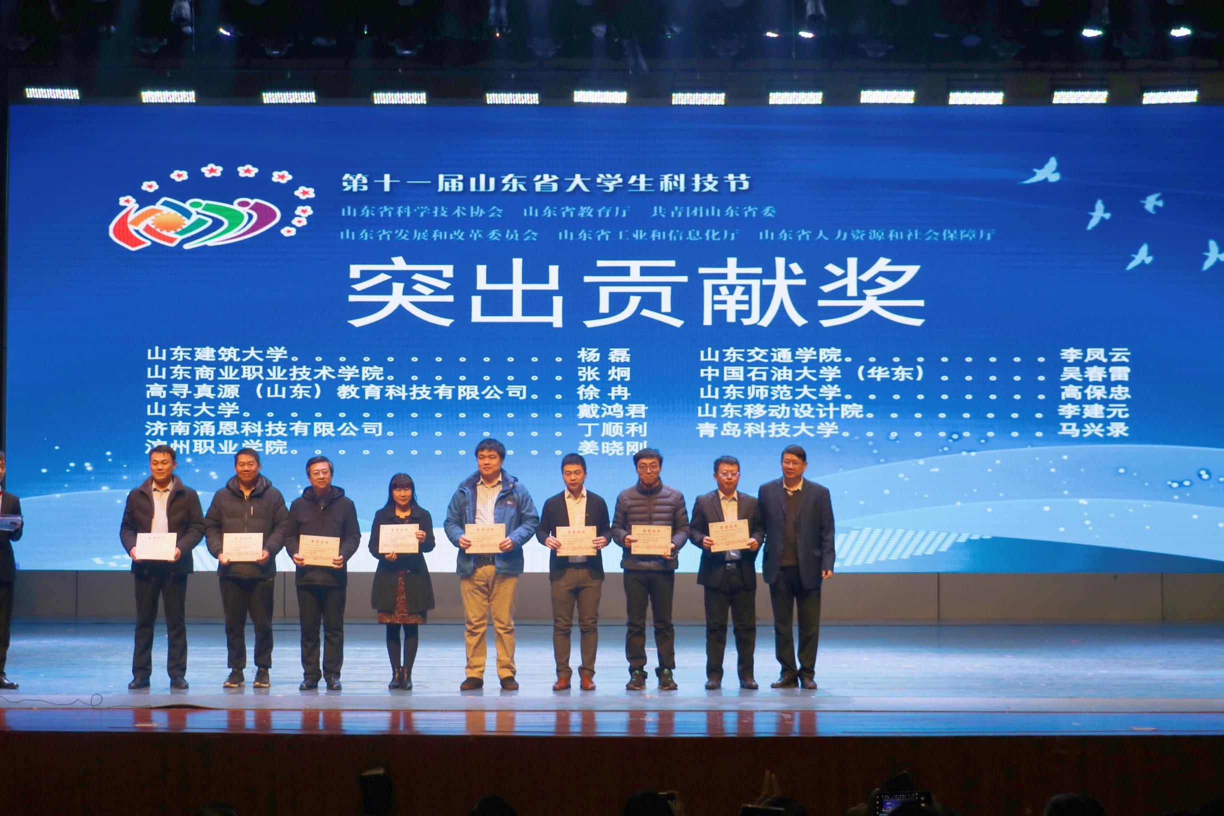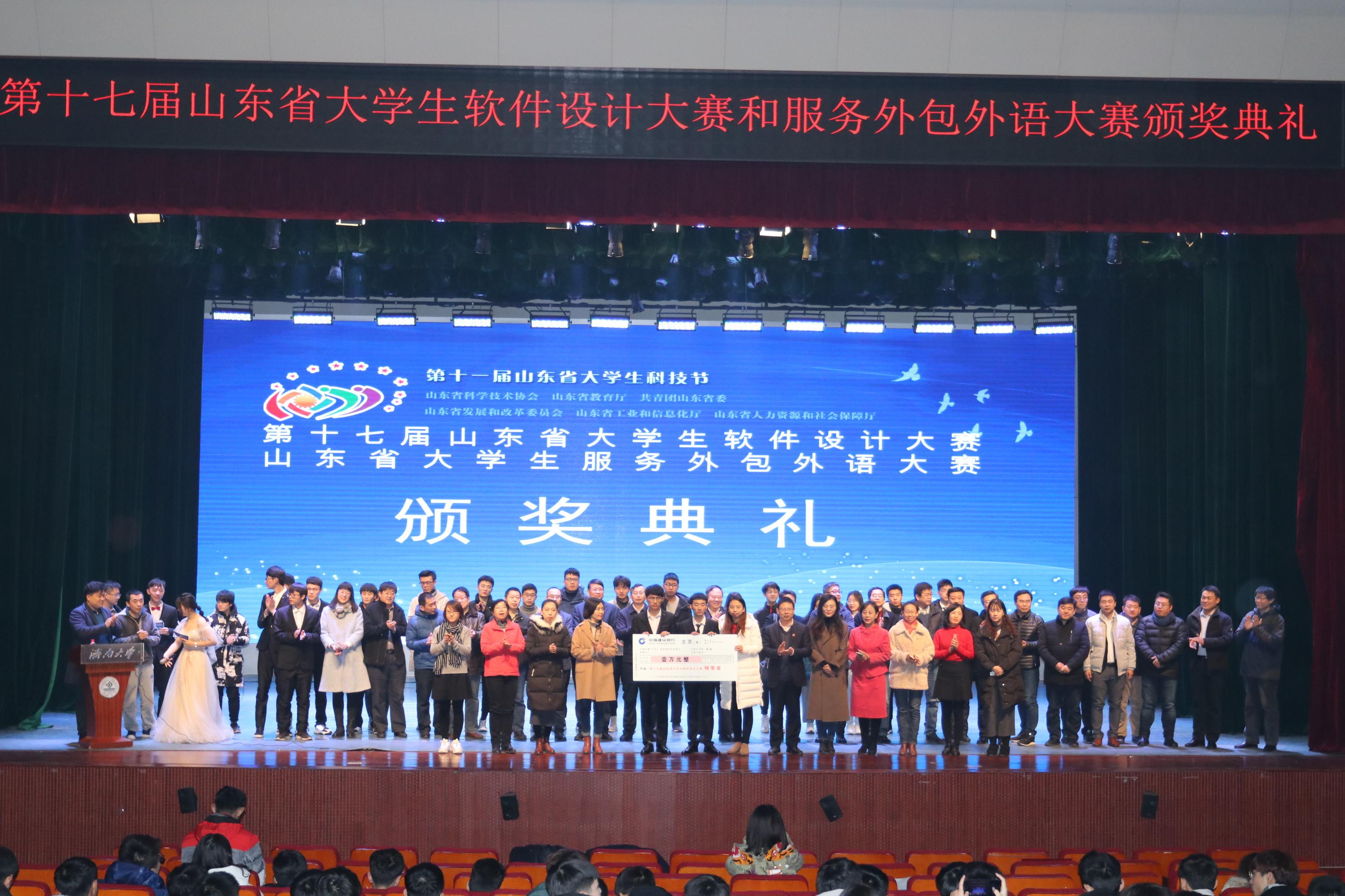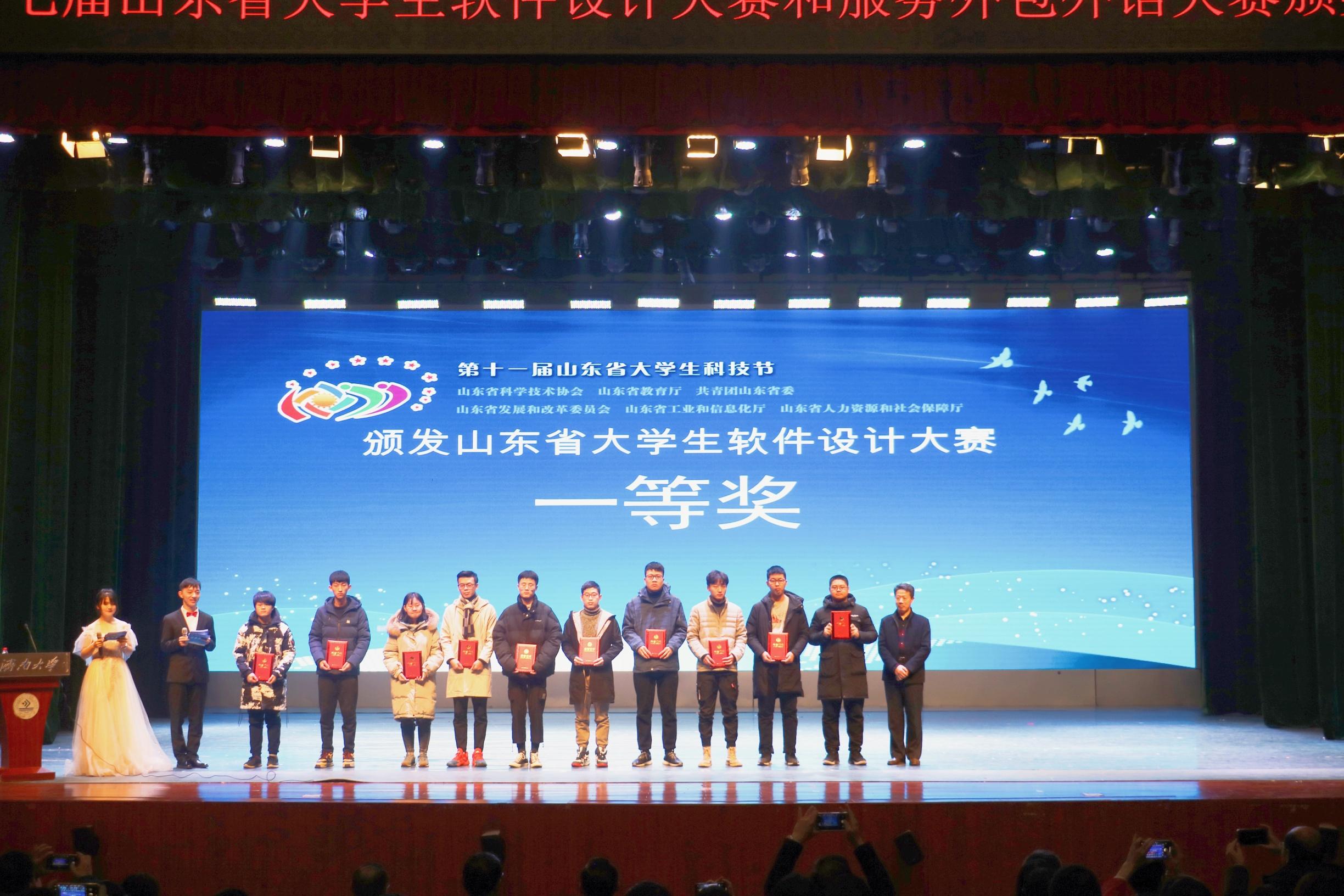 2019年12月22日,第十一届山东省大学生科技节暨第十七届山东省大学生软件设计大赛和服务外包外语大赛颁奖典礼在济南大学隆重举行。济南大学党委副书记张硕秋,济南市科学技术协会副主席李武,山东高教学会计算机教学研究专业委员会理事长、济南计算机学会理事长、山东大学教授石冰,山东省大学生软件设计大赛命题组组长、山东师范大学信息处处长刘方爱,中国计算机学会山东分会理事长、济南大学教授董吉文,济南市科学技术协会学会部部长王晓,济南计算机学会副秘书长、山东交通性吧