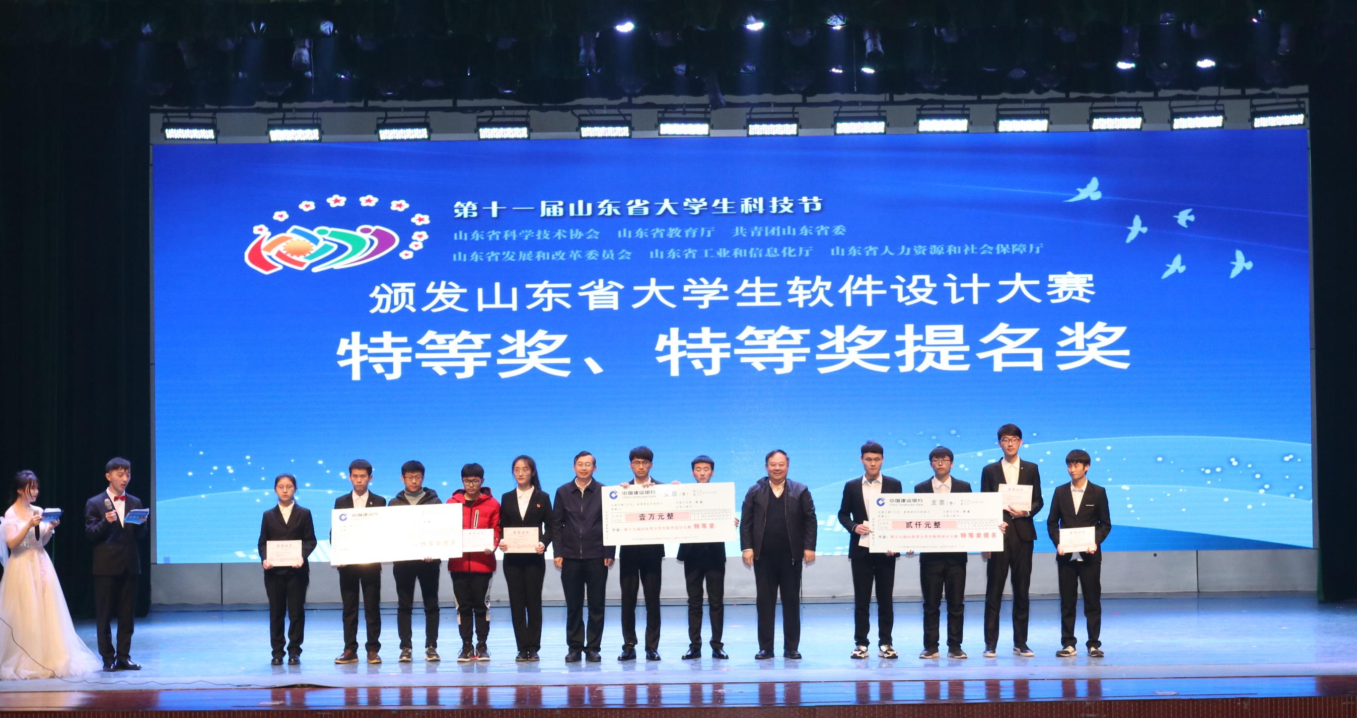 第十七届山东省软件设计大赛共有来自全省75所高校,1300支代表参赛队伍,6000人参赛。经大赛评委会评审,共评出特等奖1项,特等候选奖2项,一等奖97项,二等奖183项,三等奖289项。山东省服务外包外语大赛共评出一等奖9项,二等奖18项,三等奖25项。其中,性吧