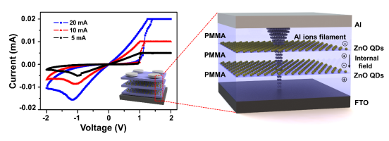 图1:基于Al/PMMA/ZnO QDs/PMMA/ZnO QDs/PMMA/FTO结构的多值RRAM性能以及其阻变物理模型