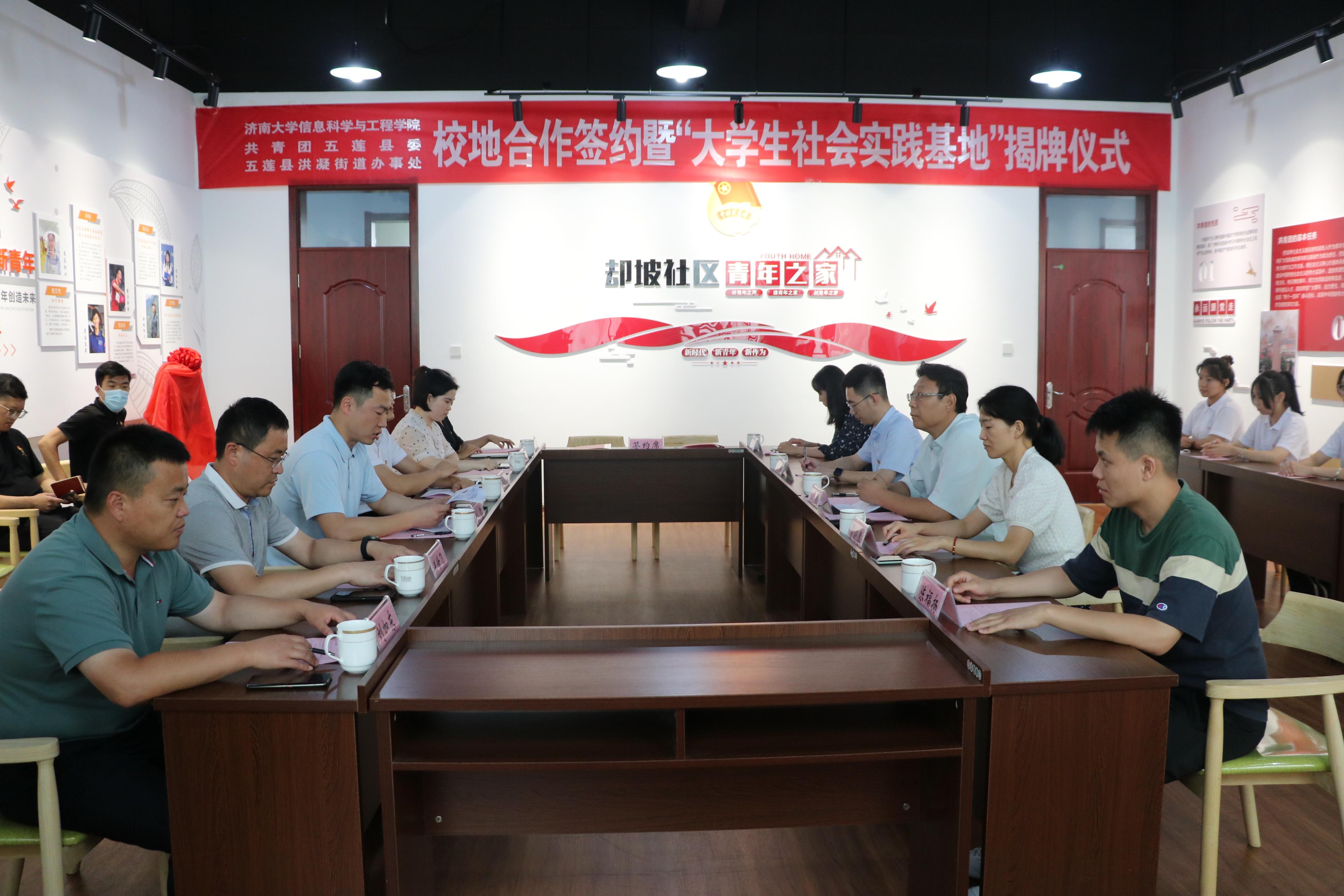 分别与五莲团县委、五莲县洪凝街道办事处签订校地合作协议,徐哲副县长和李超书记共同为“大学生社会实践基地”揭牌。签约仪式结束后,与会领导一行在却坡社区调研青春社区有关工作。