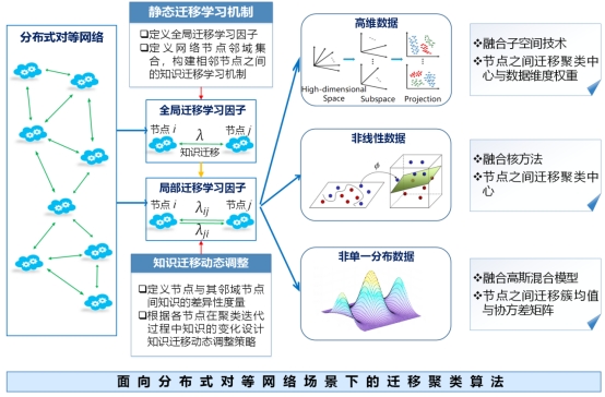 如图一和图二所示,成果聚焦分布式及多视图数据聚类场景下各网络节点及视图的信息融合问题,借鉴迁移学习理论思想,设计新型分布式及多视图迁移聚类算法。充分利用各节点、各视图的互补信息,构建节点及视图间的知识迁移学习机制,有效促进各节点及视图间的信息融合;定义合理的节点及视图间的差异性度量,准确地指导不同节点及视图间的知识迁移学习程度;根据聚类迭代过程中各节点及视图的知识变化,设计节点及视图间知识迁移的动态调整策略,提升聚类性能并确保稳定的聚类融合结果。相关研究引起西安电子科技大学、陕西师范大学、北京工业大学、上海科技大学、悉尼科技大学等高校的关注。