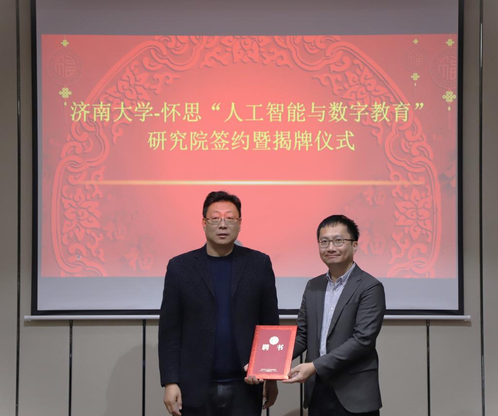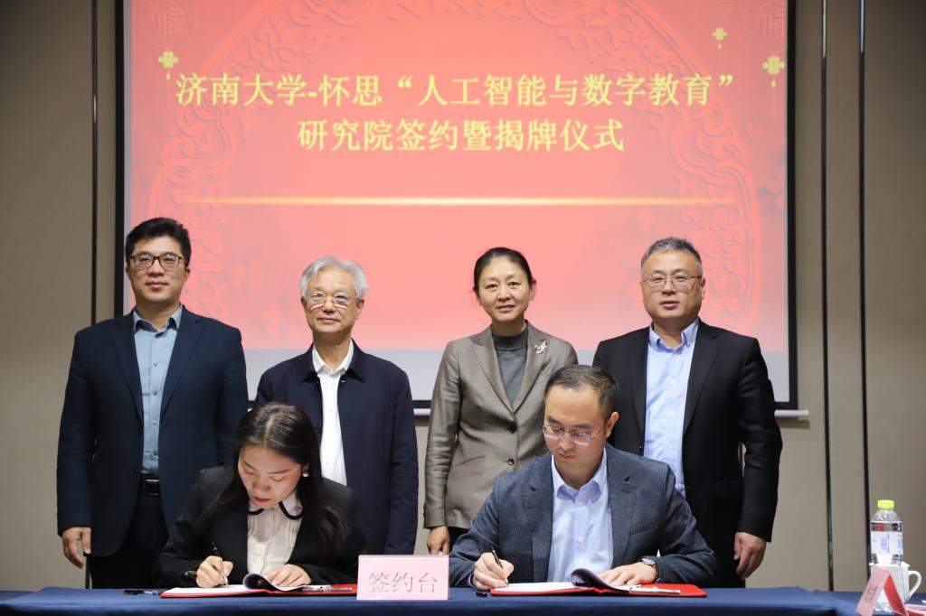 院长陈贞翔与山东怀思总经理杨阳签订了设立“人工智能与数字教育”研究院合作协议。根据双方协议,济南大学和山东怀思科技有限公司将在智能机器人科技开发、高新技术产业化、科技信息交流、人才交流、人工智能及数字教育普及等方面开展全方位合作。