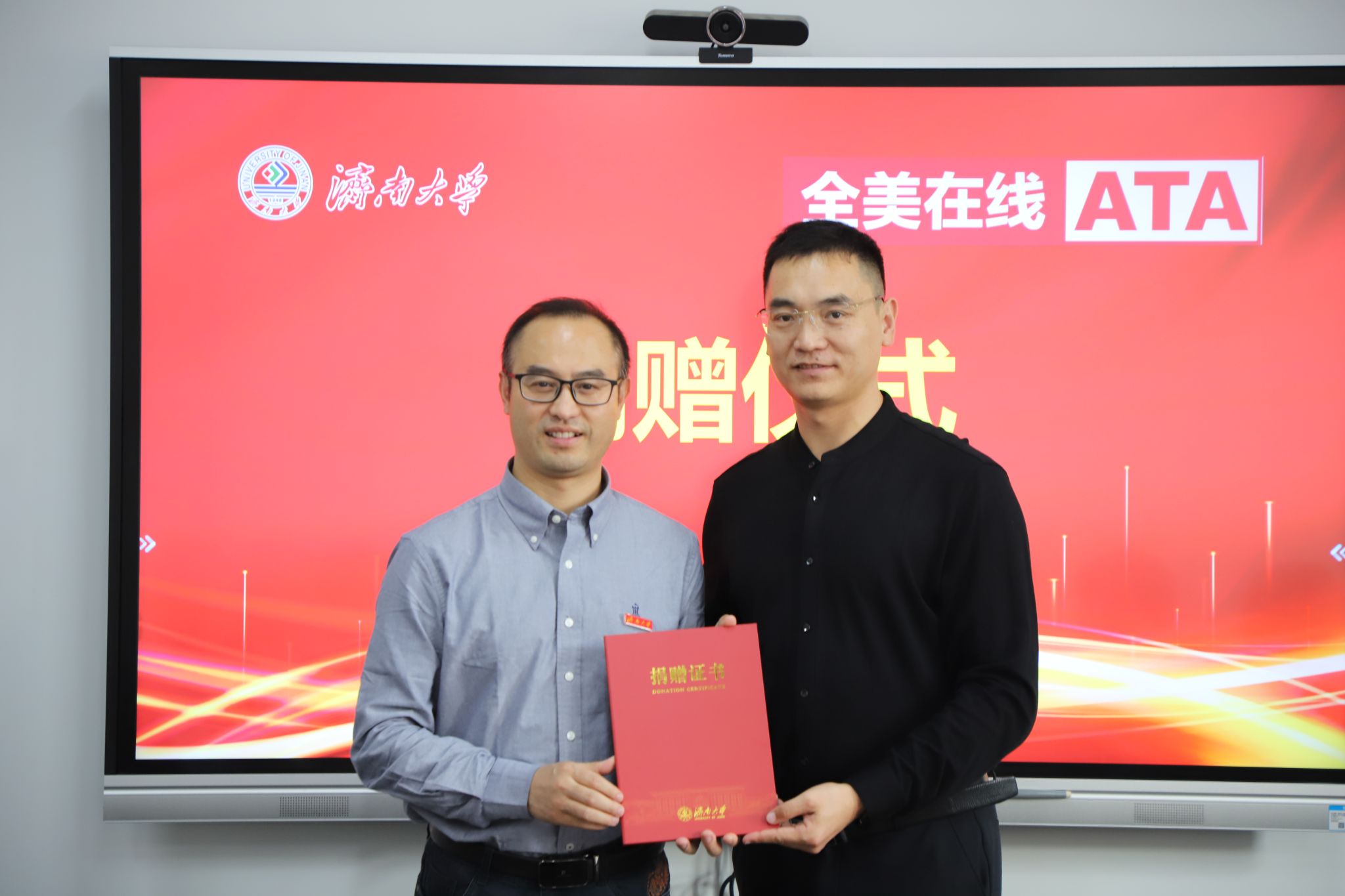 —全美在线(北京)科技股份有限公司捐赠仪式”在第十二教学楼704会议室举行。学校党委常委、副校长黄加栋,全美在线(北京)科技股份有限公司大区经理何青刚,济南大学合作发展处处长刘振,性吧