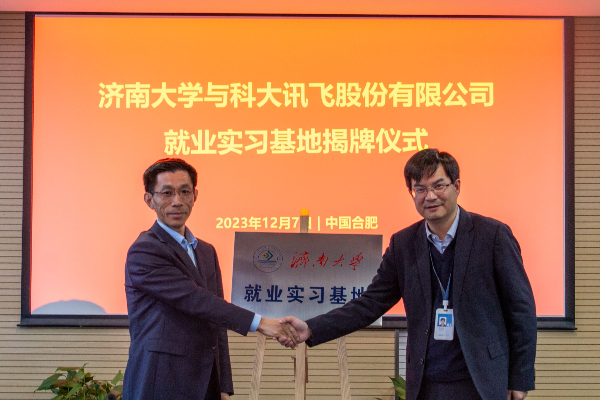 签约仪式上,济南大学党委学生工作部(处)部(处)长卢旺代表学校与科大讯飞高教业务线山东区域总监李伯威签订《毕业生就业实习基地协议》,李强和陈红斌共同为“济南大学就业实习基地”揭牌。性吧