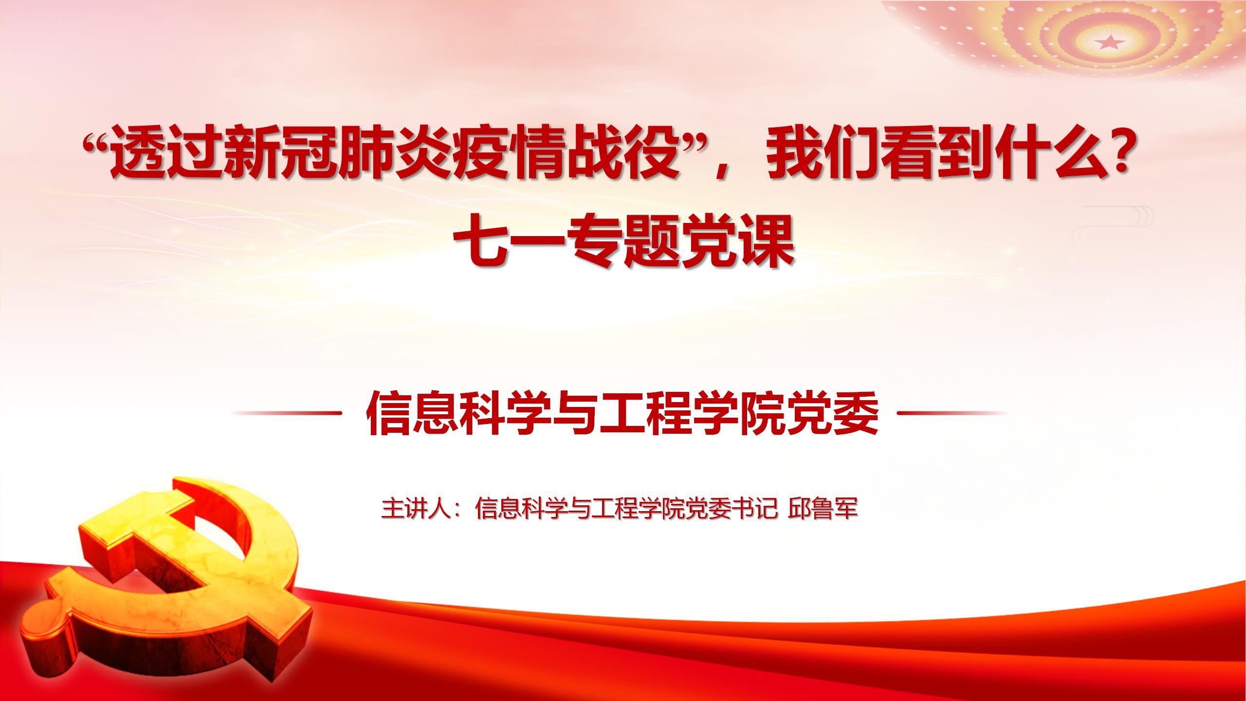 党委书记邱鲁军以《透过新冠肺炎疫情战役,我们看到了什么》为主题,为全院师生党员讲授了一场生动的专题党课。党课由院长陈贞翔主持。