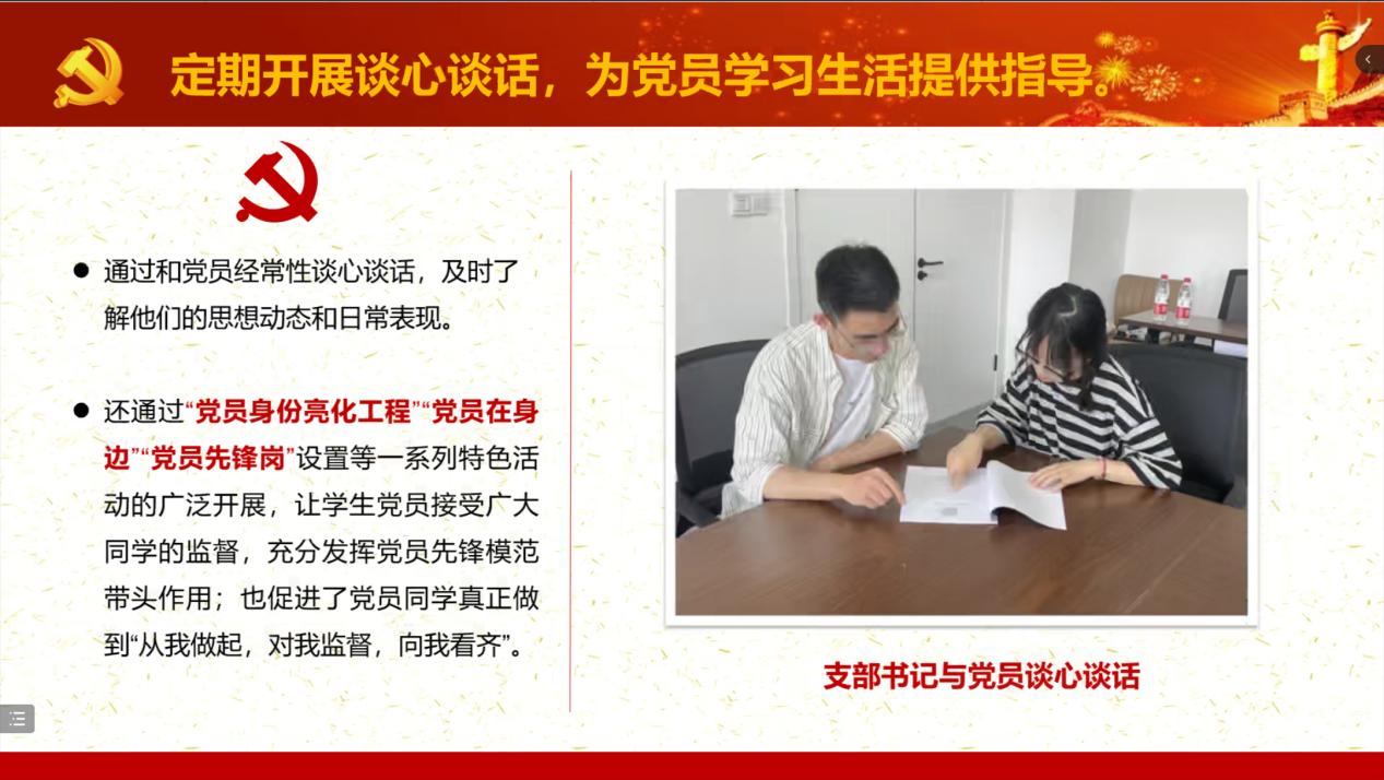 事业发展的实践力量。二是要以过硬党支部建设为抓手,进一步加强基层党支部建设。认真贯彻落实《中国共产党普通高等学校基层组织工作条例》《中国共产党支部工作条例(试行)》,创新党支部活动方式,持续培育“一支部一品牌”党建特色品牌,深入推进党建联建共建,增强党支部活力,培育高质量党建创新成果。三是要以党员队伍建设为抓手,发挥党员先锋模范作用。对党员开展多形式、分层次的教育培训,加强党员教育管理监督,进一步完善督查和考核评价机制,加强分类指导,细化责任清单,发挥党员在课程思政、学风建设、学科竞赛等方面的作用。