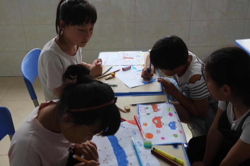 早上的第一节古诗文鉴赏课程,小朋友们都表现的格外认真。老师们首先指出了小朋友们作业中默写的错误,并逐个指导他们加以改正。随后,志愿者老师列举了“我寄愁心与明月,随风直到夜郎西”、“云想衣裳花想容,春风拂槛露华浓”等优美的诗句,不仅让小朋友们明白意象的概念,更通过描绘诗句画面让他们体会到古诗词中的古韵之美,为小朋友们打古色古香的诗词世界。第二节课,志愿者带着小朋友制作以“畅想未来三十年”为主题的绘画课,小朋友们将古灵精怪又奇思妙想的美好愿望画在纸上,让志愿者们眼前一亮。