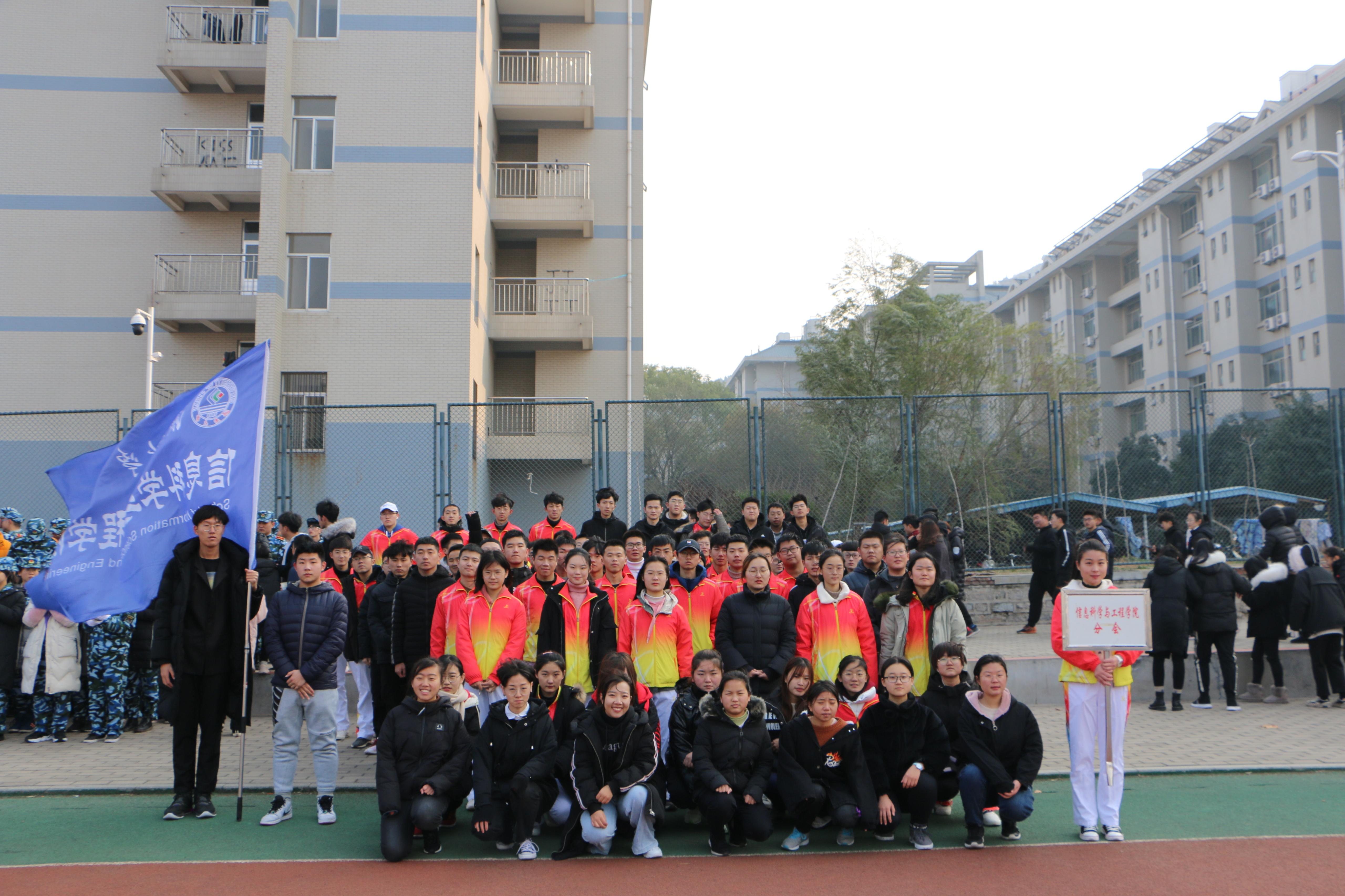 健步走队伍已在南苑操场集合完毕并排列好队伍,虽寒风凌冽却仍抵不过同学们饱满的热情。待国歌奏完后,性吧方阵追随国旗班的步伐,在迎风飘扬的院旗之下,身穿黑衣的成员与身穿鲜红队服的成员相映衬摆出红心及“70”字样,口中高喊“勿忘国耻,砥砺前行,七十筑梦,信科先行”的洪亮口号,脚踏铿锵有力的步伐整齐前行,在南苑操场完成两圈的健步走,手握五星红旗的健步走成员们,眼神中流露出的是对祖国富强的骄傲和弘扬1 29爱国精神的坚定信念。环绕结束后全体成员共唱济大校歌,伴随着校歌的演唱停止,本次健步走活动也圆满结束。