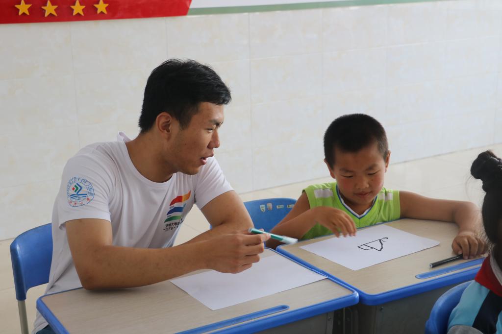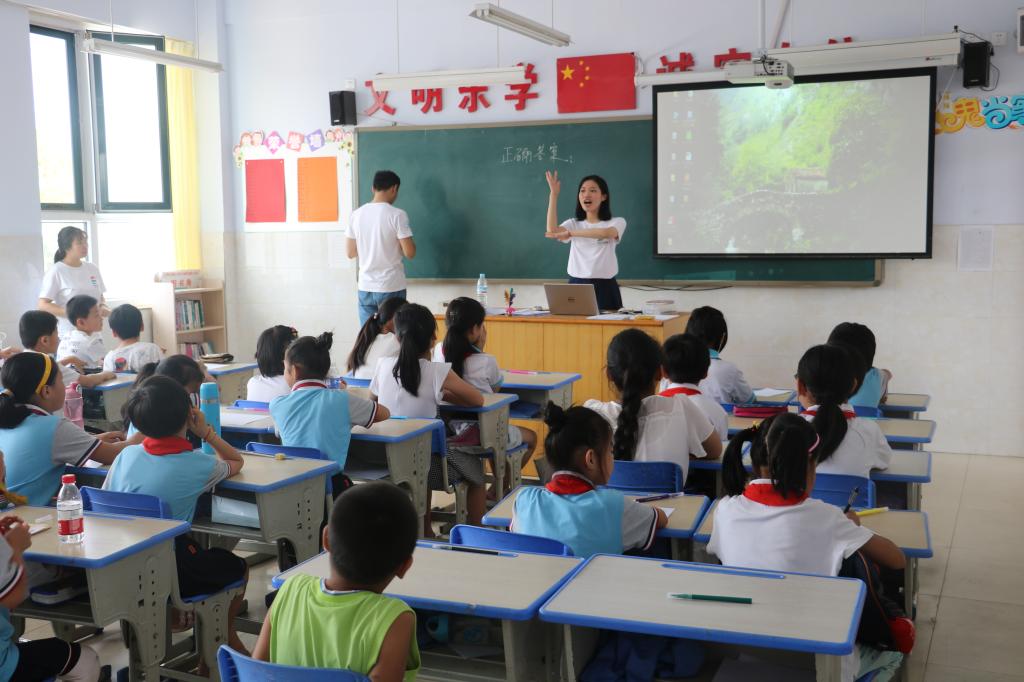 “信莲心”暑期社会实践团队在日照市五莲县槎河小学进行了“你画我猜”趣味启蒙式英语课教学和折纸手工课。
