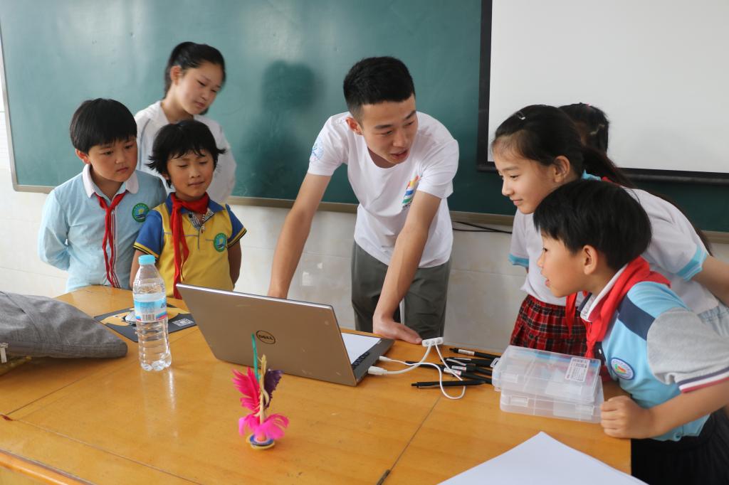 上午,志愿者老师们进入教室进行授课,由于授课对象为二年级到五年级的小学生,年龄跨度较大,志愿者根据年龄及他们意愿进行分组,分成了7个小组。在英语课上,将生活中的常见事物以PPT投影的形式展现给孩子们,吸引孩子们的注意力,通过组间合作,让孩子们积极交流,共同完成“你画我猜”的任务。课堂上,老师将孩子们成功画出的事物进行英文讲解,并制定了积分奖励荣誉榜,随堂检测并进行奖励。孩子们表现出了极大的兴趣和热情,在老师的帮助下,孩子们循序渐进,每当他们顺利地完成目标,都会在荣誉榜积分累计得分,随着积分的累加,他们脸上洋溢着成功的喜悦,志愿者老师们也露出了欣慰的笑容。