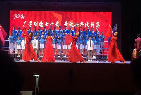 大幕拉开,两位朗诵者声情并茂,慷慨激昂,对济大七十周年诚挚的祝福声声入耳。节目伊始,在信院学子铿锵口号中,济南大学校歌《你我同行》的合唱展开帷幕。说唱者们鼓舌扬唇,爽朗激扬,于舞台驰骋,用青春的语调唱响着莘莘学子对济大热忱的爱。舞步轻盈,《我爱你中国》在舞者妙曼的舞姿中徐徐道来,如林籁泉韵,声动梁尘,热烈高亢。演唱者女声细腻,男声浑厚,在磅礴气势中述出风华正茂,芳华尚好。观众席灯光摇曳,节拍琅琅,对祖国挚爱回荡于胸腔,袅袅于礼堂,拳拳赤子之心油然而生。