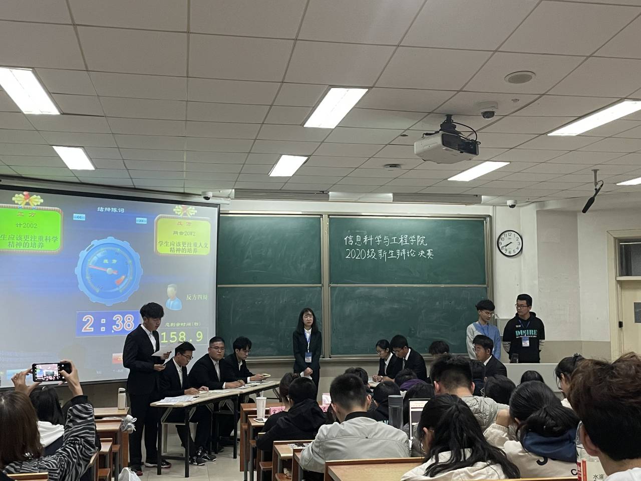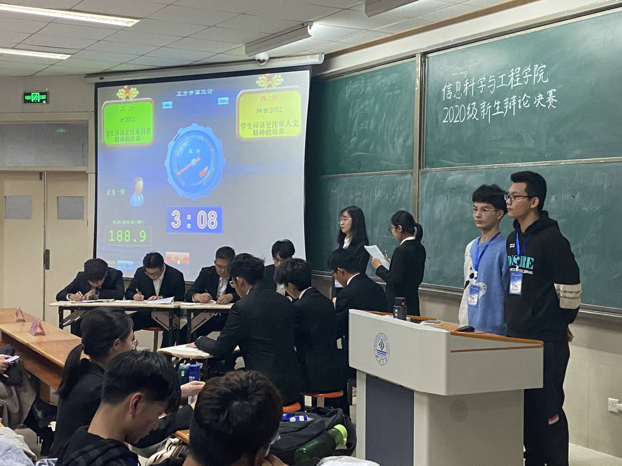 在11J1102教室举办2020级新生辩论大赛。该院王倩老师及各院辩论队队长担任此次比赛评委。决赛共分两场,上半场正方为计2002班,反方为网合20w2班;下半场正方为网合20w3班,反方为计2005班。