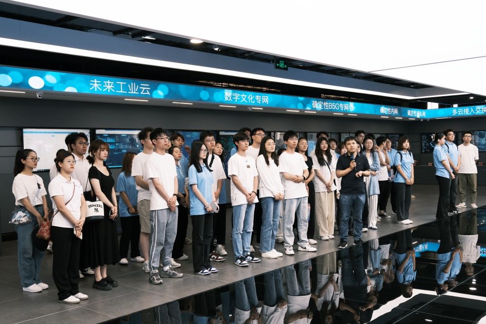 师生一行首先来到山东未来网络研究院,山东未来网络研究院是以未来网络关键技术研究和原始创新为核心的山东省重点科技创新载体,致力于解决一批工业互联网共性关键技术“卡脖子”问题,打造立足山东、服务国家、面向世界、研发转化体系健全、对接国际一流水平的工业互联网重大科技创新平台。在讲解员的带领下,同学们集体参观了科技成果展厅,详细了解研究院成立背景、科技创新成果及确定性网络建设情况,通过能源、数字文化专网、多云接入交换平台和确定性算网一体化等确定性网络应用的典型案例,深入了解确定性网络在工业互联网领域的强大赋能作用。