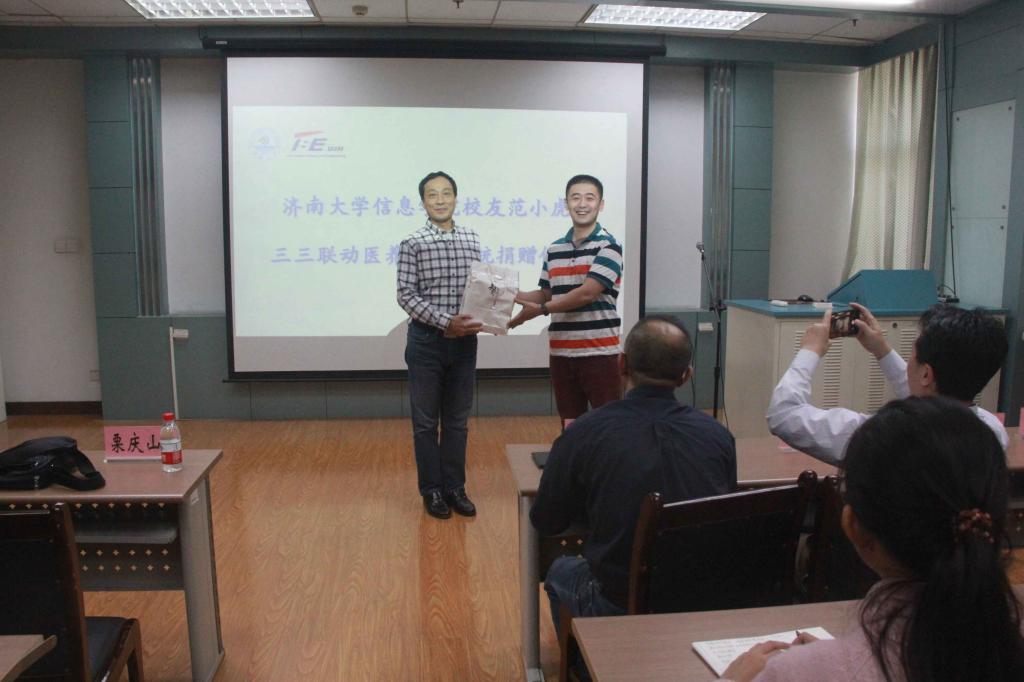 之后,校友范小虎向校医院捐赠设备并讲话。范小虎在发言中讲述了创业初衷、历程和对母校的感恩。范小虎表示,在距离家乡1000公里外的武汉生活,无法及时照顾父母的安全和健康,经过调研,现在很多老人都存在这个问题。在谷歌人工智能研究的启发下,他们开始尝试运用传感器和物联网技术解决如何实时检测家人健康的问题。当家中的老人意外跌倒、突发心脏病和高血压时,公司研发的监测器能够敏锐地捕捉到这些信息并及时与家人、医院联系和报告。范小虎讲到,2008至2011年在济南大学读书,也是土生土长的济南人,对母校对老师怀有真切的感情,通过此次捐赠感恩老师、回馈母校。
