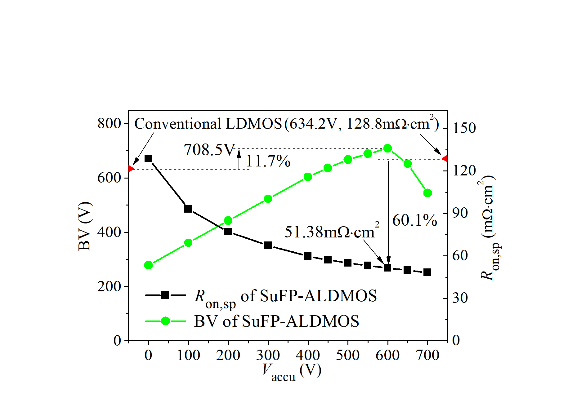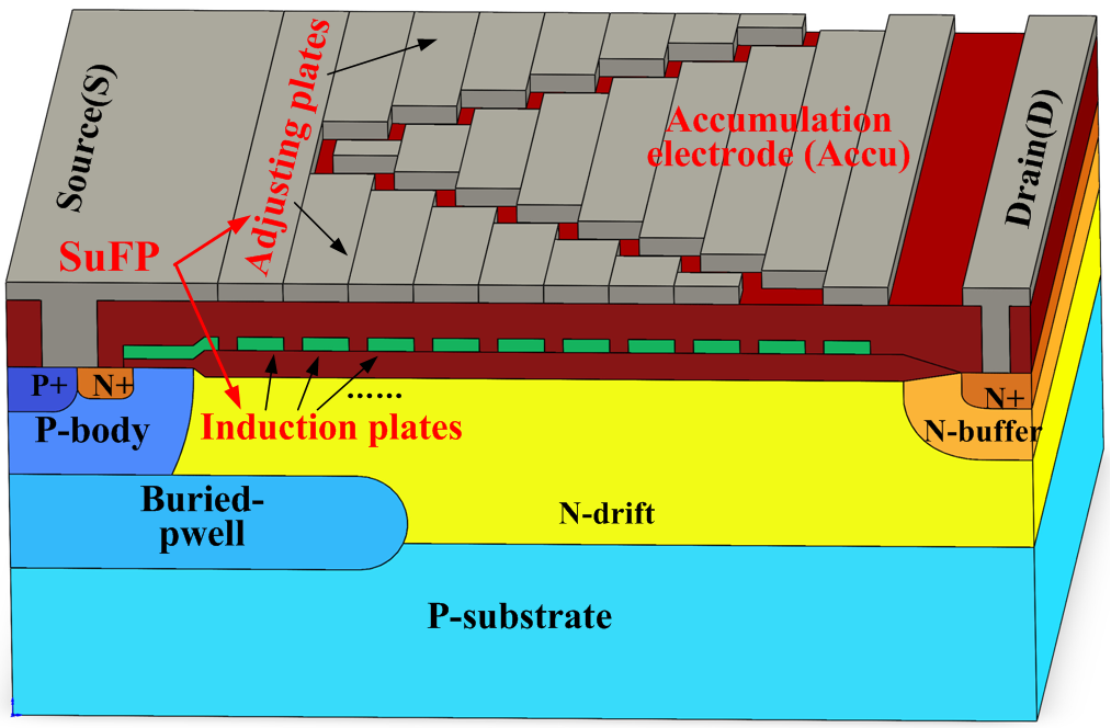 团队针对LDMOS器件漂移区掺杂浓度使器件耐压能力和导通电阻此消彼涨、无法同时提升的关键问题,提出利用感应电荷代替杂质电离电荷控制器件载流子和电场分布的策略,通过引入连接系统VDD的积累电极控制浮空感应场板,使其在器件耐压状态下感应负电荷、调制电场分布,在器件导通状态下感应正电荷、感应增加漂移区载流子浓度,从而实现器件的击穿电压和导通电阻同步提升,突破了耐压能力和导通电阻相互制约的问题。基于600V耐压等级的LDMOS实验结果显示,器件在关态下实现了均匀的电场分布,耐压能力提升11.7%,同时,器件工作于VDD= 600V系统的导通电阻降低了60.1%,器件综合性能(FOM)提升211.1%达到世界先进水平。该新型器件结构与现有制备工艺完全兼容,同时也与系统应用兼容,相比其他技术在成本和兼容性方面具有明显的优势,对未来功率器件发展具有重要推动作用。